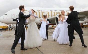 Anlässlich des Jubiläums überraschte die Airline Passagiere mit Walzer-Tanzeinlage am Flughafen.